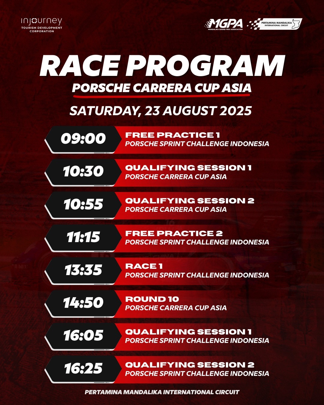 “Event Porsche Carrera Cup Asia (PCCA) di Sirkuit Mandalika tahun ini dirancang dengan padat, rapi, dan penuh hiburan. Selain balapan utama seri ke-10, 11, dan 12, penonton juga bisa menikmati sesi latihan dan kualifikasi. Seri kali ini juga menghadirkan Porsche Sprint Challenge Indonesia (PSCI) yang menghadirkan pembalap-pembalap Indonesia,”jelas Priandhi Satria.
