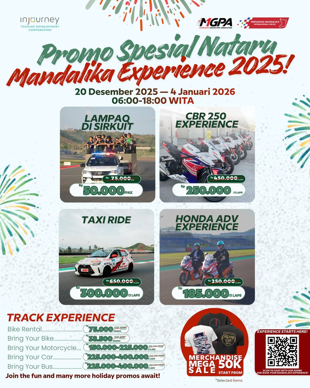 “Kolaborasi ITDC, MGPA, dan para tenant menjadi kunci menghadirkan pengalaman liburan yang berkesan bagi wisatawan. ITDC mengajak wisatawan untuk merayakan libur Natal dan Tahun Baru di Mandalika, menikmati keindahan pantai, kemeriahan malam pergantian tahun, serta pengalaman sport tourism di sirkuit. “Hadiah di balik setiap deru di The Mandalika adalah semangat yang membangkitkan hati,” tutup Agus.(itdc/*)